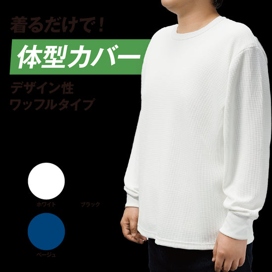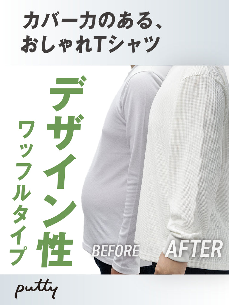 putty 長袖Tシャツ【ワッフル生地】 ノンアイロン&速乾性を備えた快適な長袖Tシャツ 薄手で表情のある生地を採用し、快適な着心地を実現したシリーズです。putty独自の前面のみ二重構造で、目立ちにくさを最大限に追求しました。さらに、内側の生地には外側とは異なる、通気性と吸汗性に優れた素材を使用。ポリエステル素材ながらコットンのような柔らかさと、ワッフル編みならではの立体感がスタイリッシュな印象を演出し、一枚で洗練されたおしゃれな雰囲気を醸し出します。また、ノンアイロン・速乾性・抗ピリング性を備え、型崩れしにくく、美しいシルエットをキープ。 ※写真のモデルは身長175cm、体重80kgで、Lサイズを着用しています。 <素材> 品番:PT204 素材:ポリエステル100% 原産国:日本 カラー:ホワイト・ブラック・ネイビー <サイズ> Mサイズ:身丈70cm、肩幅50cm、身幅57cm、裾幅51cm、袖丈56.5cm Lサイズ:身丈72cm、肩幅52cm、身幅60cm、裾幅54cm、袖丈58cm XLサイズ:身丈73cm、肩幅54cm、身幅64cm、裾幅57cm、袖丈59.5cm XXLサイズ:身丈74cm、肩幅56cm、身幅68cm、裾幅60cm、袖丈59.5cm 3XLサイズ:身丈76cm、肩幅58cm、身幅72cm、裾幅63cm、袖丈59.5cm ご注文に関する注意事項※ギフトラッピングは承っておりません。 ※お客様都合の返品・返金はお受けいたしかねます。 ※商品はご注文受付日から約1〜5営業日以内に日本郵便で発送いたします。但し、長期休業時は6営業日以上お日にちをいただく場合がございます。 ※15,000円以上(税込)お買い上げで送料無料となります。