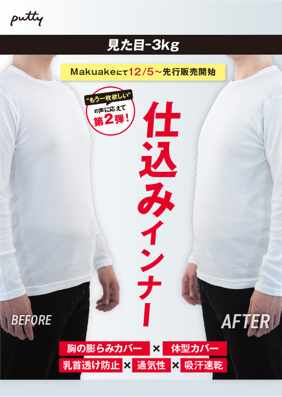 putty 長袖Tシャツ【厚手】 <胸の膨らみを気にせず着られる、厚手仕様の長袖Tシャツ> 厚みのある生地を採用し、胸の膨らみをしっかり隠すことができるシリーズです。putty独自の前面のみ二重構造で、目立ちにくさを最大限に追求しました。中に肌着を着用いただくと、さらに効果がアップします。 素材には、コットンのような肌触りを持つ肉厚なポリエステル生地を採用。型崩れやシワが起こりにくいだけでなく、吸水速乾性にも優れています。また、ノンアイロン仕様のため、お手入れも簡単です。さらに、タグを裾側に配置することで、首元の不快感を軽減し、快適に着用いただけます。 ※写真のモデルは身長175cm、体重80kgで、Lサイズを着用しています。 <SPEC> 品番:PT201 素材:ポリエステル100% 原産国:日本 カラー:ホワイト・ブラック <サイズ> Mサイズ:身丈70cm、肩幅50cm、身幅57cm、裾幅51cm、袖丈56.5cm Lサイズ:身丈72cm、肩幅52cm、身幅60cm、裾幅54cm、袖丈58cm XLサイズ:身丈73cm、肩幅54cm、身幅64cm、裾幅57cm、袖丈59.5cm XXLサイズ:身丈74cm、肩幅56cm、身幅68cm、裾幅60cm、袖丈59.5cm 3XLサイズ:身丈76cm、肩幅58cm、身幅72cm、裾幅63cm、袖丈59.5cm 4XLサイズ:身丈76cm、肩幅60cm、身幅78cm、裾幅68cm、袖丈59.5cm ご注文に関する注意事項※ギフトラッピングは承っておりません。 ※お客様都合の返品・返金はお受けいたしかねます。 ※商品はご注文受付日から約1〜5営業日以内に日本郵便で発送いたします。但し、長期休業時は6営業日以上お日にちをいただく場合がございます。 ※15,000円以上(税込)お買い上げで送料無料となります。